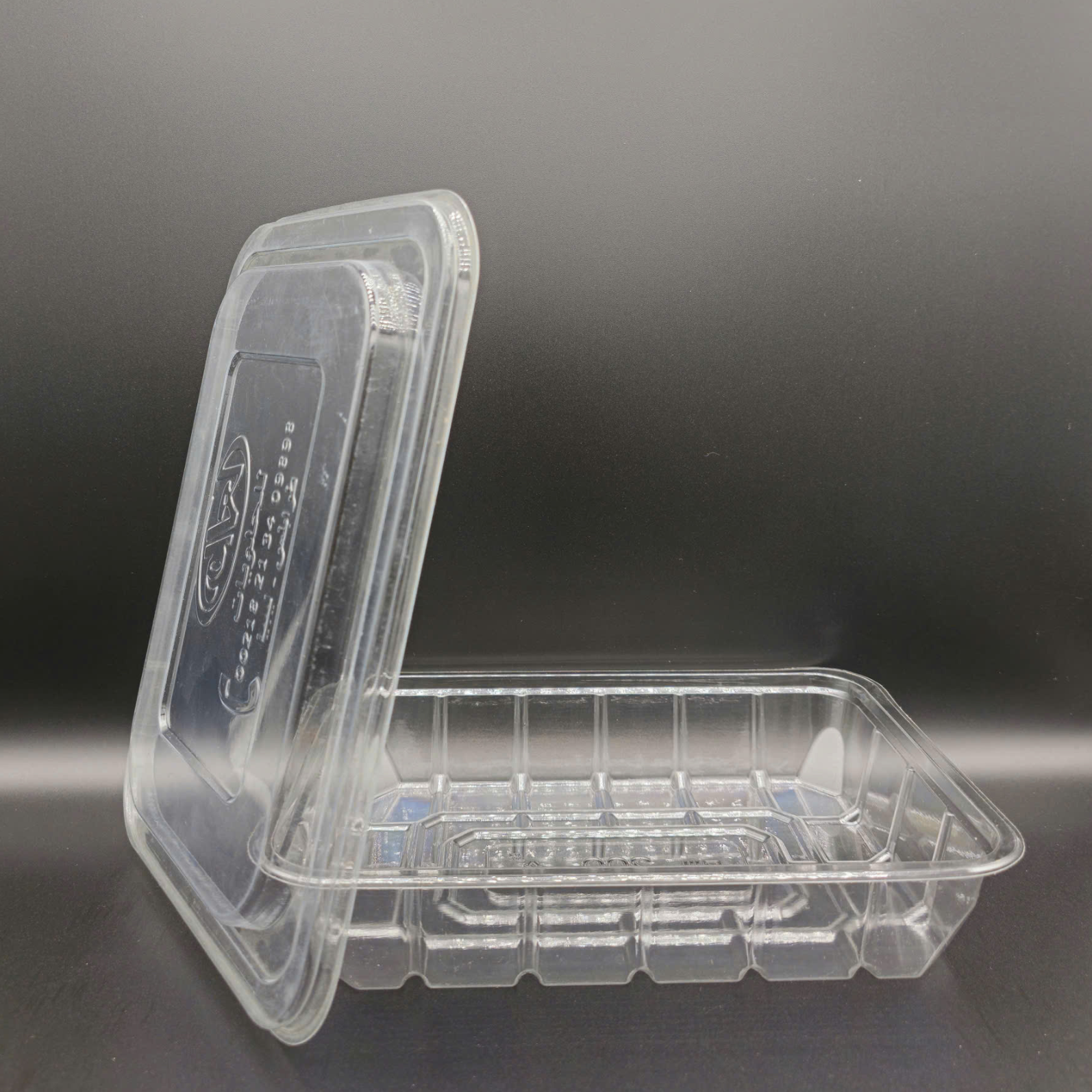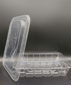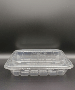 BOX 200 is a large-capacity clear PET clamshell container ideal for packaging fresh-cut fruits, salads, and chilled foods. The integrated hinged lid closes securely to prevent leaks and contamination during transport. Its tall walls with vertical ribs enhance structural strength and maintain stability during stacking or bulk storage. The grooved base aids in drainage, keeping products dry and extending shelf life in refrigerated conditions. The transparent finish provides excellent product visibility, while the flat lid surface is ideal for branding, labeling, or barcode application. Made from recyclable, food-safe PET material, BOX 200 is the perfect choice for supermarkets, convenience stores, and central kitchens seeking clean, practical, and high-clarity packaging solutions.