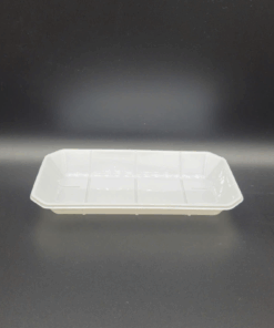 The HD-M01-13 Meat Tray is a white, food-grade plastic tray with rigid walls and a ribbed, channeled base that keeps juices away for a clean look; raised rim holds its shape and grips overwrap film; lightweight, stable for stacking, and ideal for packing meat, fish, seafood, and pre-cut produce in supermarkets and central kitchens