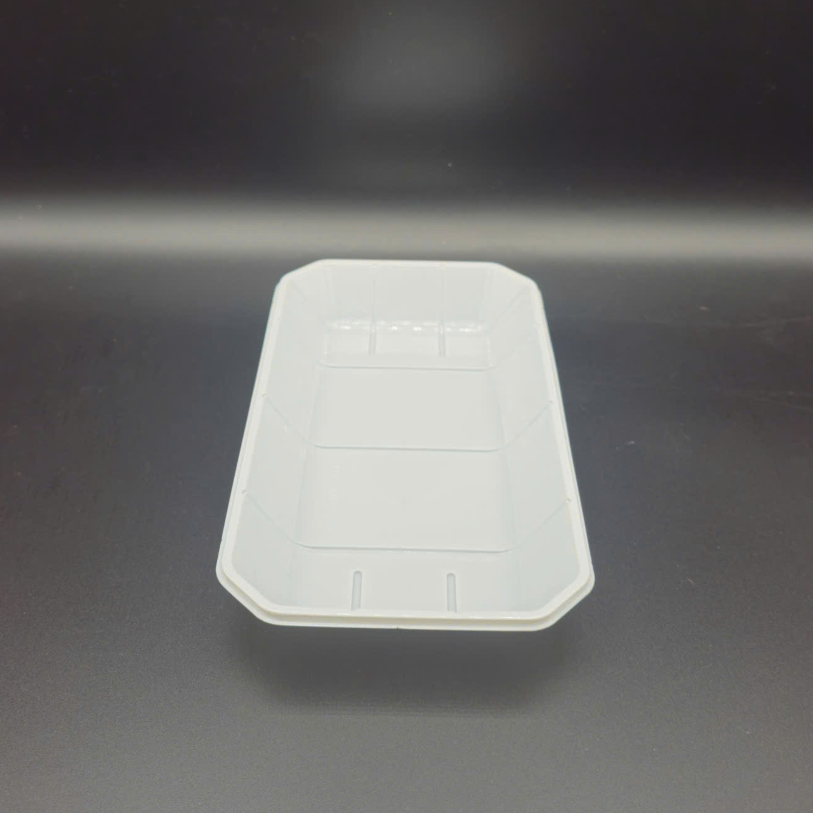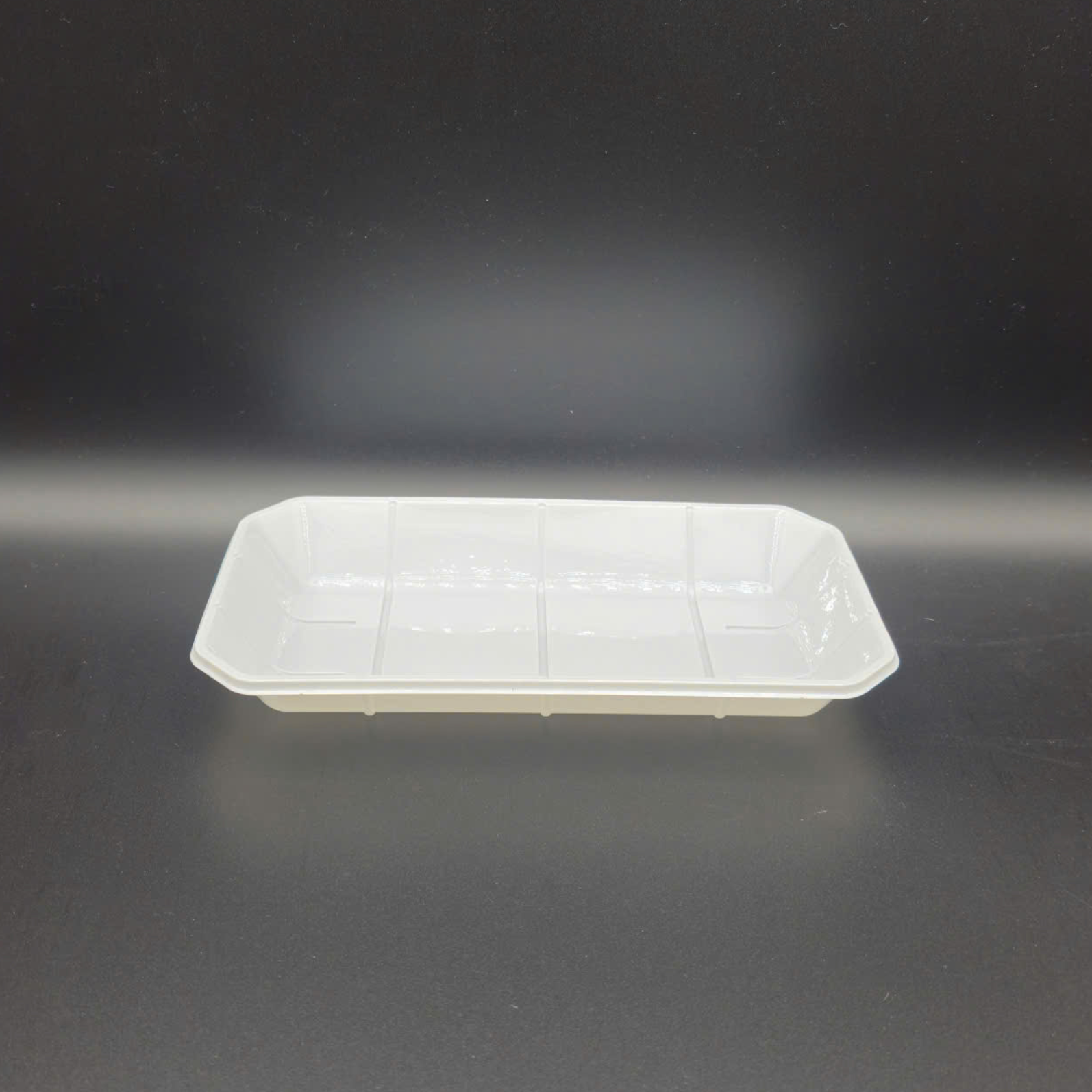Made from food-contact-safe plastic, the HD-M01-13 presents products on a clean white surface that highlights freshness and allows easy inspection. A stiff construction with bottom reinforcements resists bending on the scale or during handling, while drainage channels collect liquids to keep the top dry and tidy on display. The tall rim provides a secure sealing surface for PE/PP overwrap or shrink film, enabling fast, tight, and professional packaging; molded feet align for stable stacking to save shelf and storage space and to travel safely. Suitable for pork, poultry, beef, fish/seafood, and prepared fruits/vegetables. Wipe clean, keep away from microwaves/ovens and high heat; recyclable where facilities exist