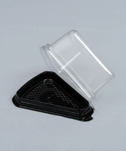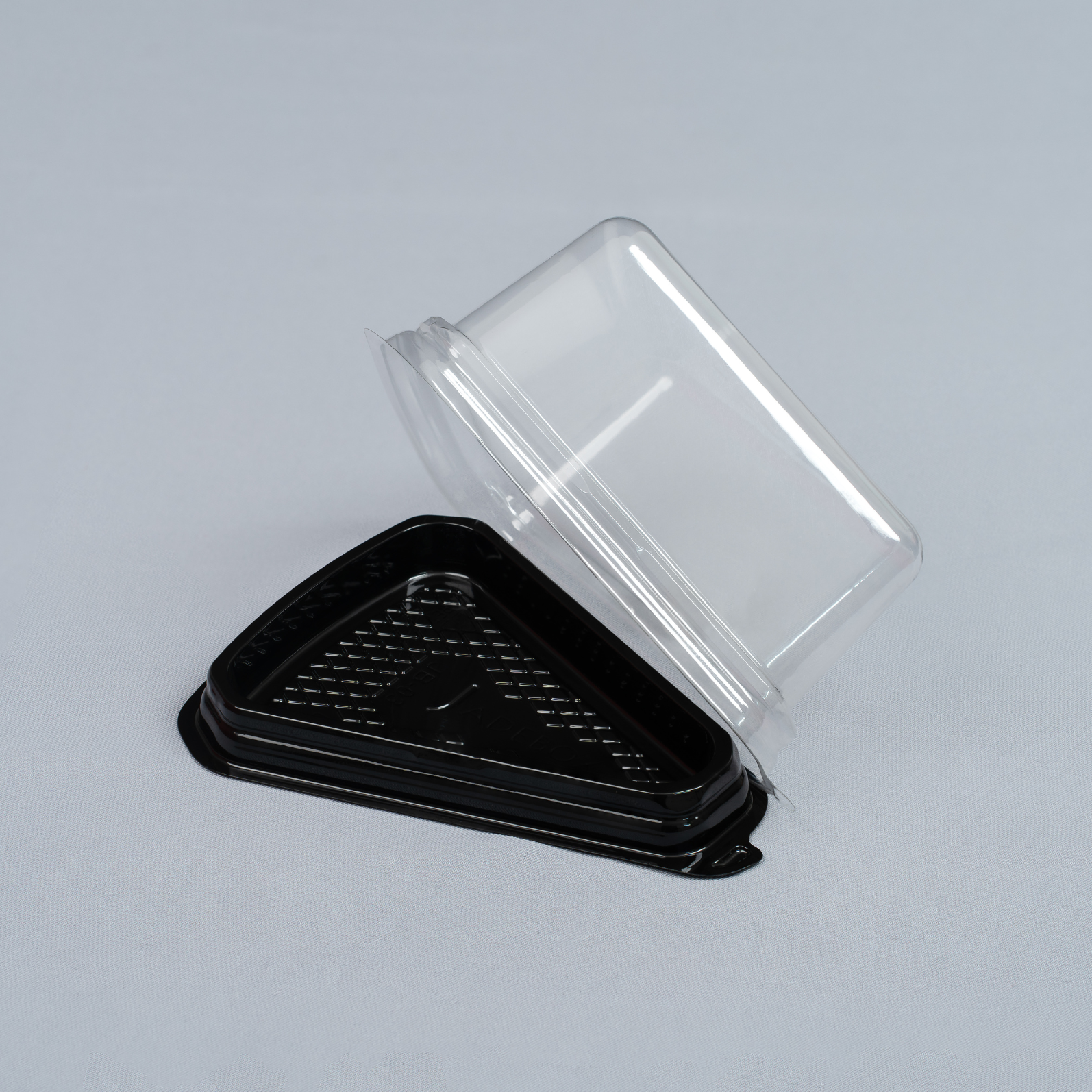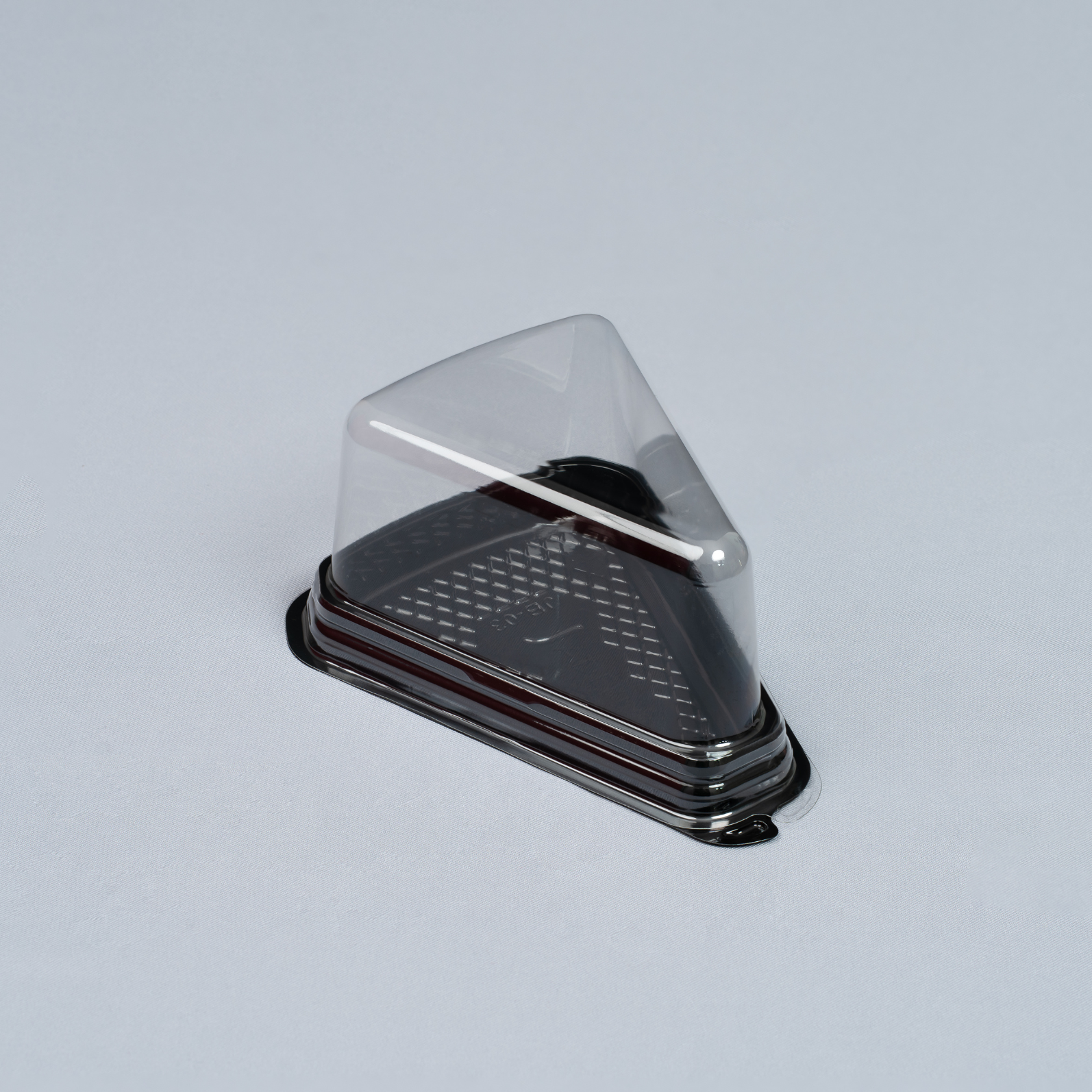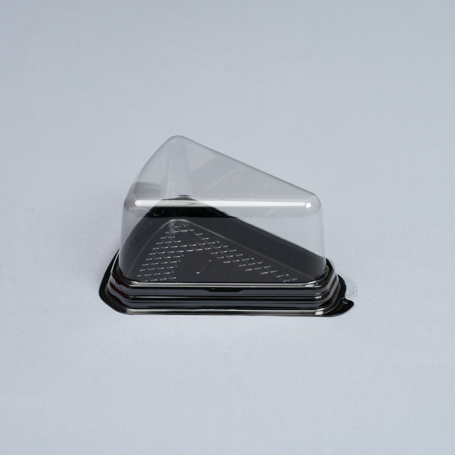 Designed for single triangular cake slices, the JB-03 features a crystal-clear dome lid that showcases decorations while providing ample headroom for toppings. The sturdy black base includes a fine anti-slip texture to keep the slice in place during transport, and a small lift tab on the lid enables quick, hygienic handling. Reinforced ribs add rigidity for reliable stacking in display cases or delivery boxes. With clean labeling areas and a tight snap closure for freshness, JB-03 delivers a premium presentation for cake slices, cheesecake, tiramisu, and mousse desserts in bakeries, cafés, supermarkets, and takeaway services