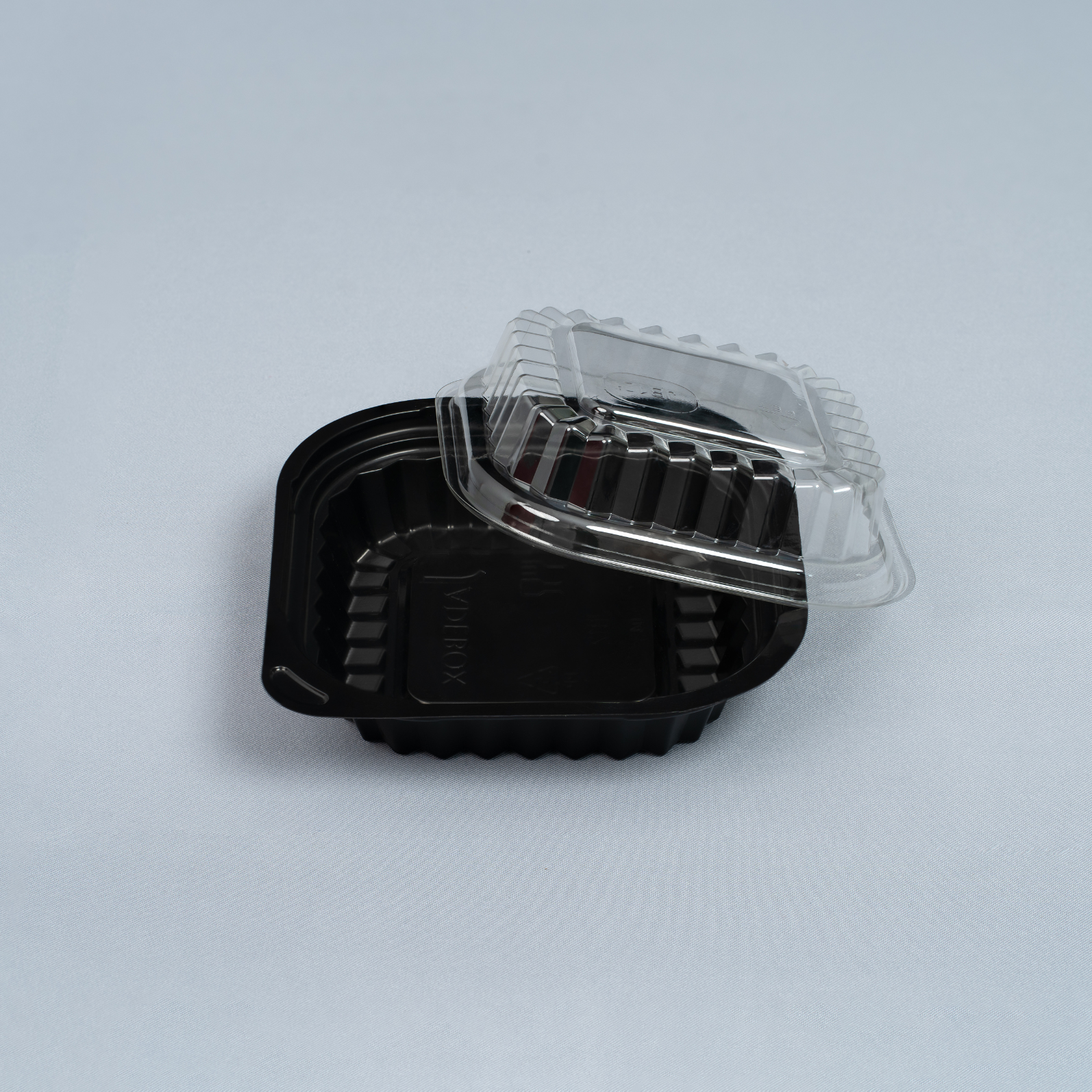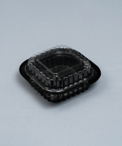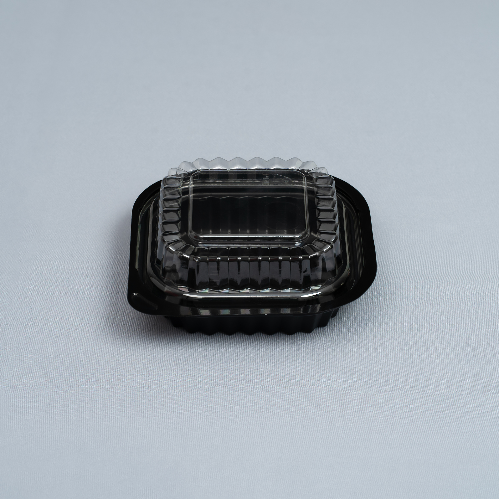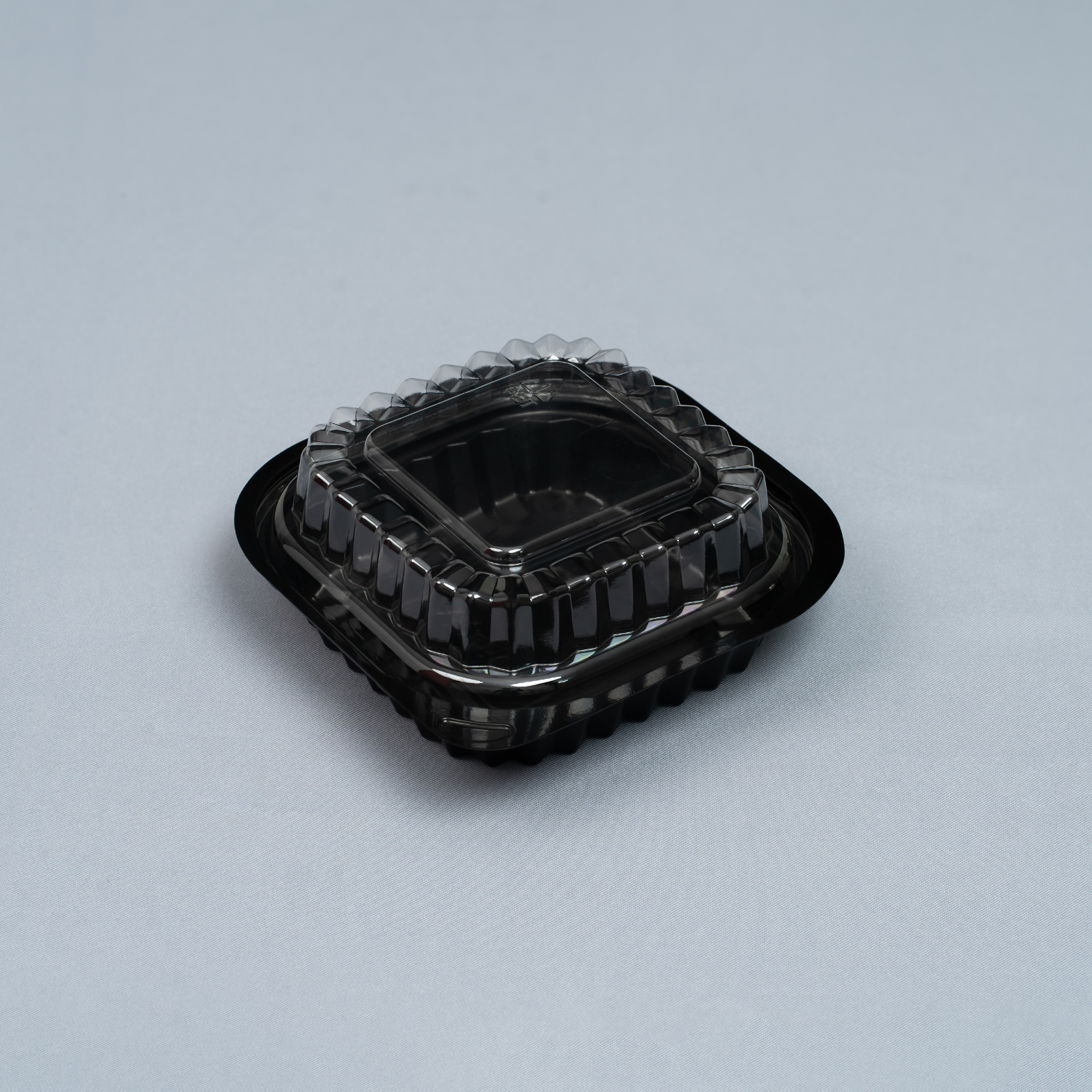 JB-12 combines elegance and practicality with its matte black base and ultra-clear lid, creating a refined display for small servings. The reinforced dome lid snaps securely to prevent leaks or shifts during delivery, while the durable PET body maintains rigidity and form. Its smooth surface allows easy branding with stickers or printed logos. Compact yet deep enough for layered desserts, pastries, sushi, fruit, or light meal portions, JB-12 is ideal for cafés, bakeries, and restaurants offering modern take-away experiences. It’s the perfect balance between hygiene, style, and functionality in professional food packaging.