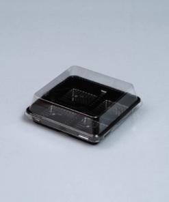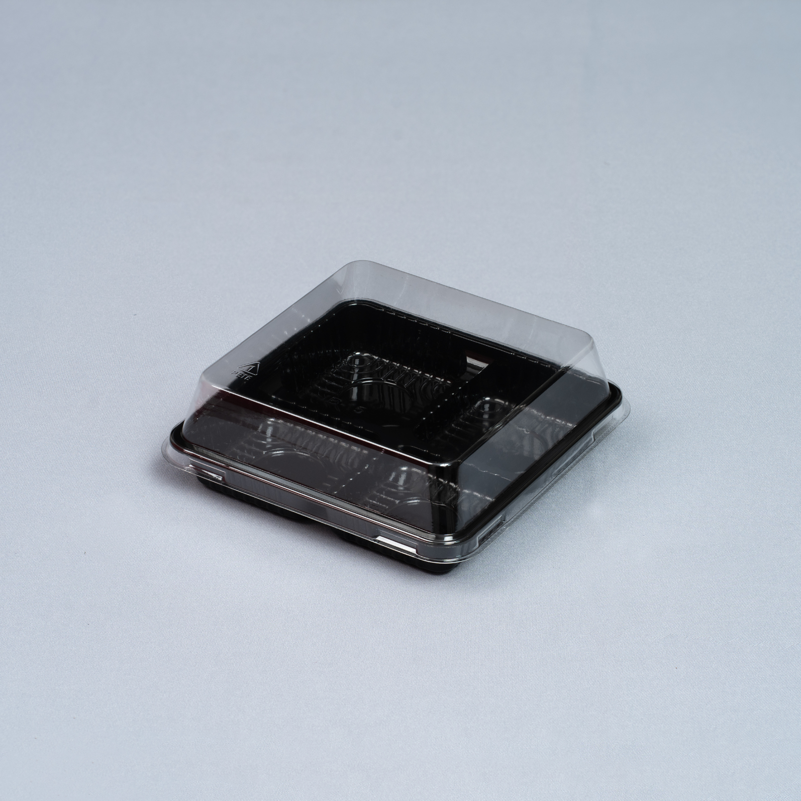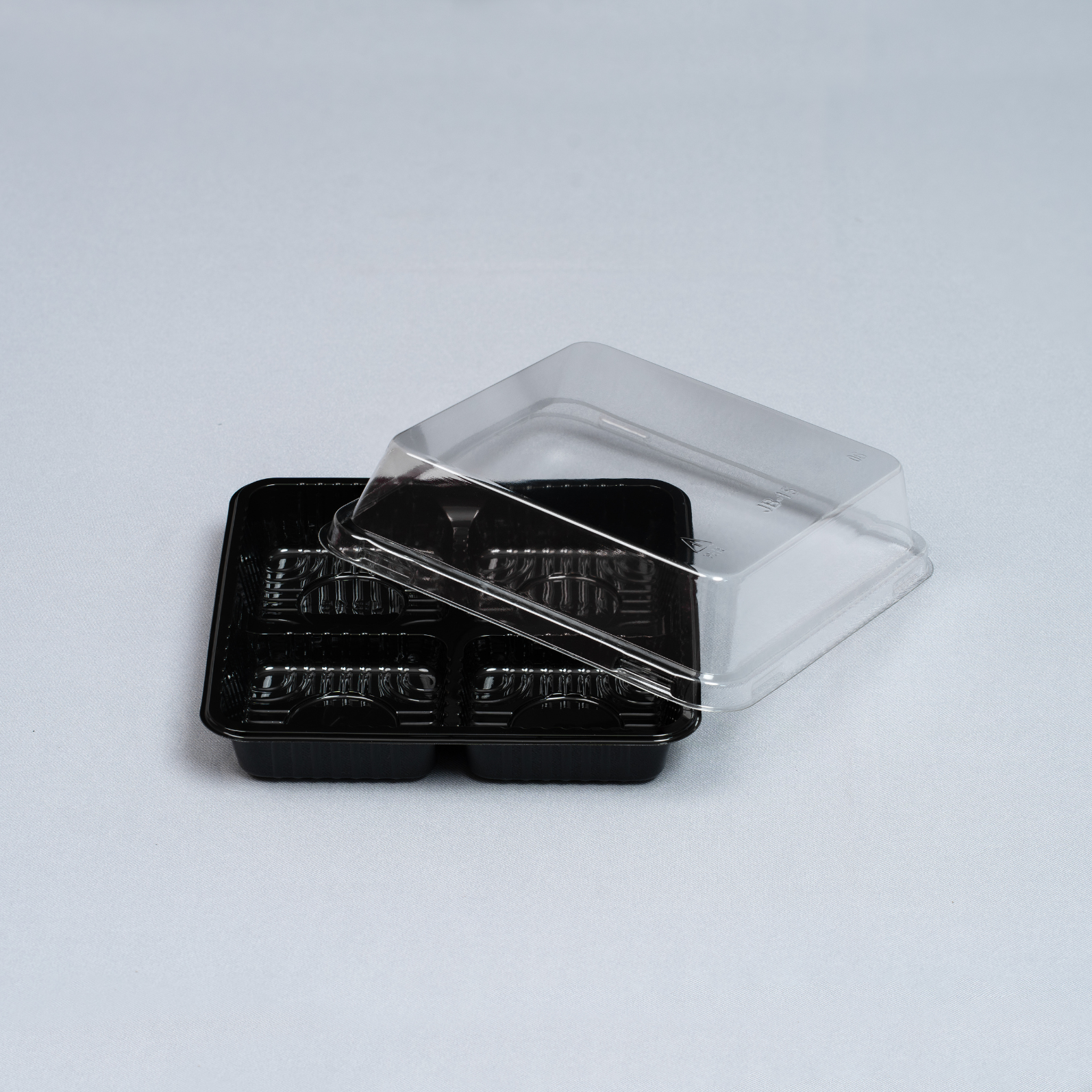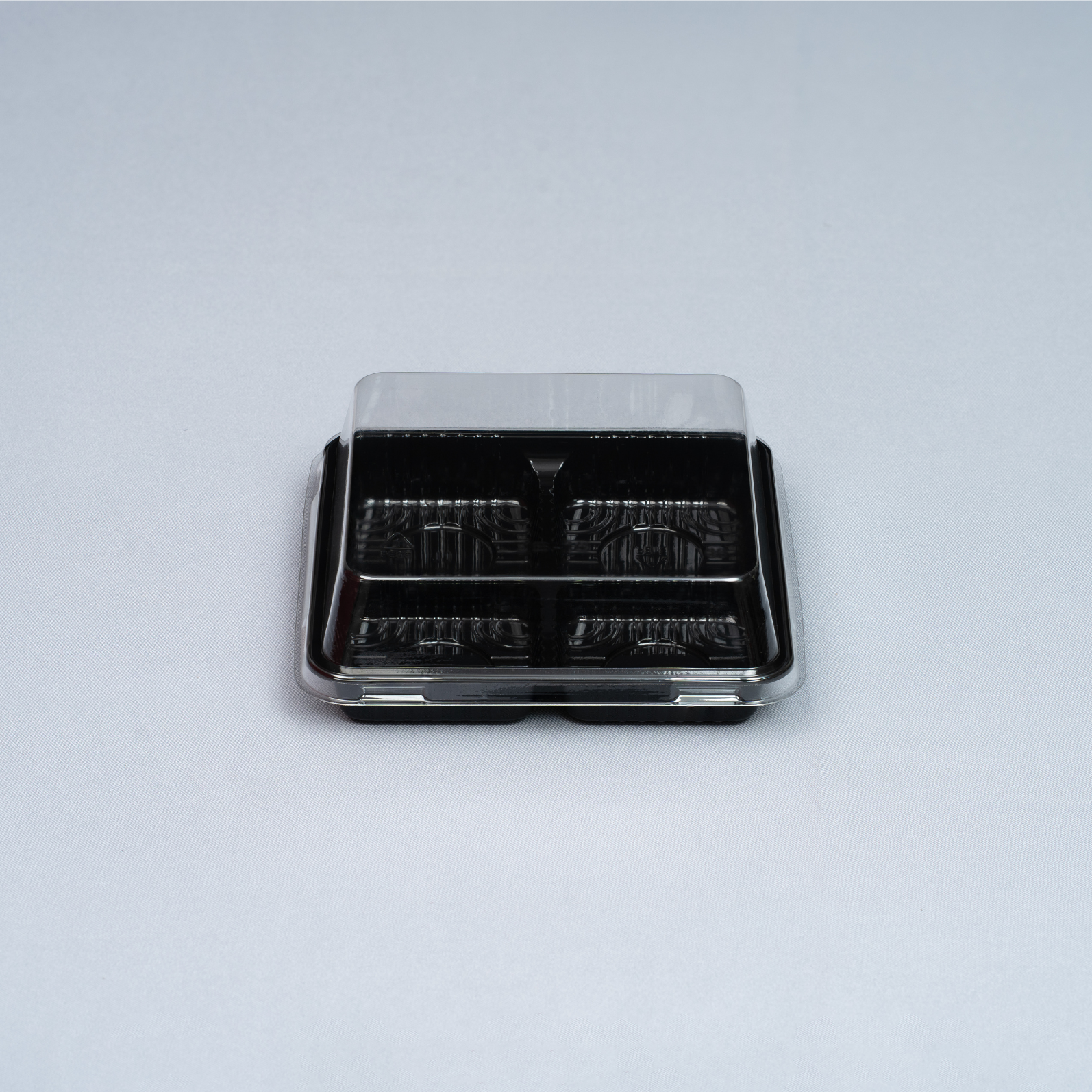 The JB-15 pastry box features four equal compartments to hold individual pieces securely and prevent flavor transfer. Its high, clear dome lid showcases decorations while protecting toppings, snapping firmly onto the rim for a reliable seal. The black, ribbed base adds rigidity and a premium look, enabling stable stacking for display or delivery. Smooth edges and flat label areas support branding and tamper seals. Versatile and hygienic, JB-15 is perfect for packaging mochi, mini mooncakes, truffles, handmade chocolates, gummies, or mixed cookies across bakeries, cafés, supermarkets, and takeaway counters