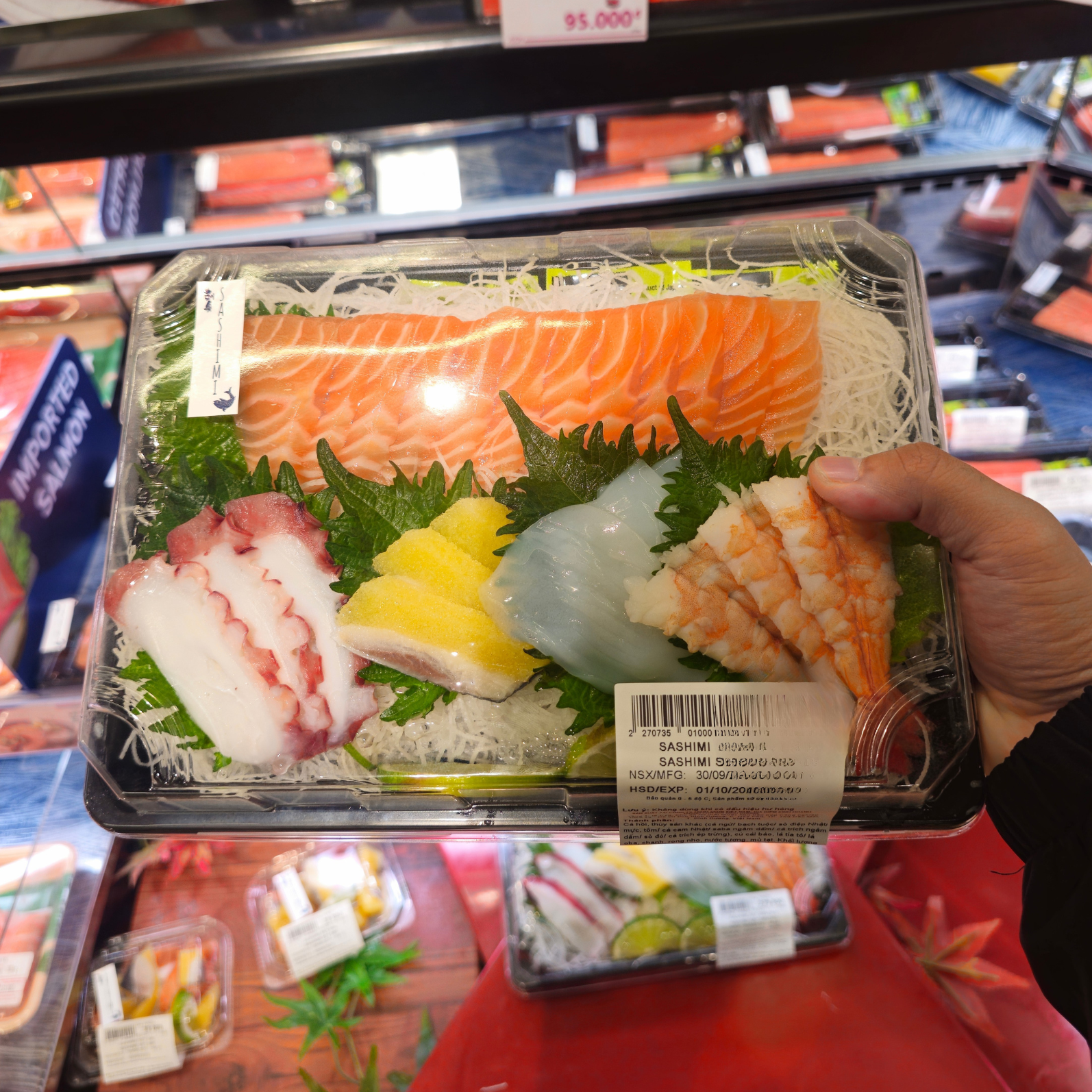 Hộp JB-ST6 đế đen, nắp trong suốt, trình bày đẹp và chắc tay. Gân cố định miếng, viền cao chống xô lệch, xếp chồng ổn định—phù hợp sashimi/sushi mang đi và trưng bày siêu thị