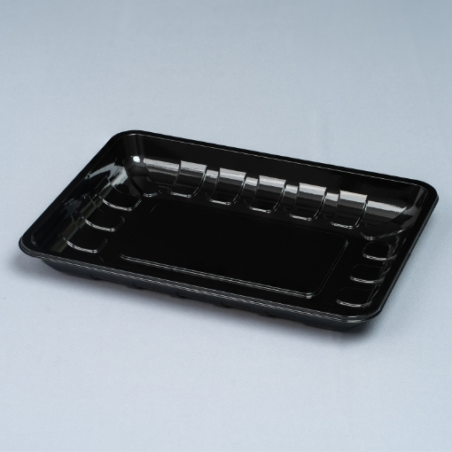 Khay M15 có thiết kế phẳng, rãnh cong quanh viền giúp thoát dịch và tăng độ cứng. Bề mặt đen bóng nổi bật sản phẩm tươi, thích hợp đóng gói thịt, cá, rau củ hoặc các món chế biến sẵn trong tủ mát siêu thị